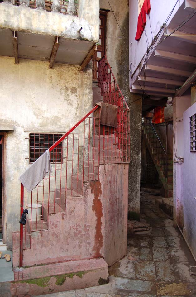 De trap is natuurlijk het opvallendste nieuwe ding in huis. Bij dit huis wordt handig gebruik gemaakt van het trapbordes van de verdieping. Het dient meteen als luifel voor de voordeur van het benedenhuis. Merk op dat over de waslijnen een zeiltje ligt om het wasgoed te beschermen tegen de felle zon en neerdwarrelend stof. In het droge seizoen komt veel stof uit het binnenland van India in Mumbai terecht en raakt alles uiteindelijk bedekt met een bruin laagje. Negen maanden lang valt er geen drup regen en de stoflaag is daarom altijd aanwezig. De eerste regen van de moesson spoelt alles weer schoon en dat zorgt voor blije gezichten. Gebouwen, straten, planten en bomen krijgen hun oorspronkelijke kleur weer terug.